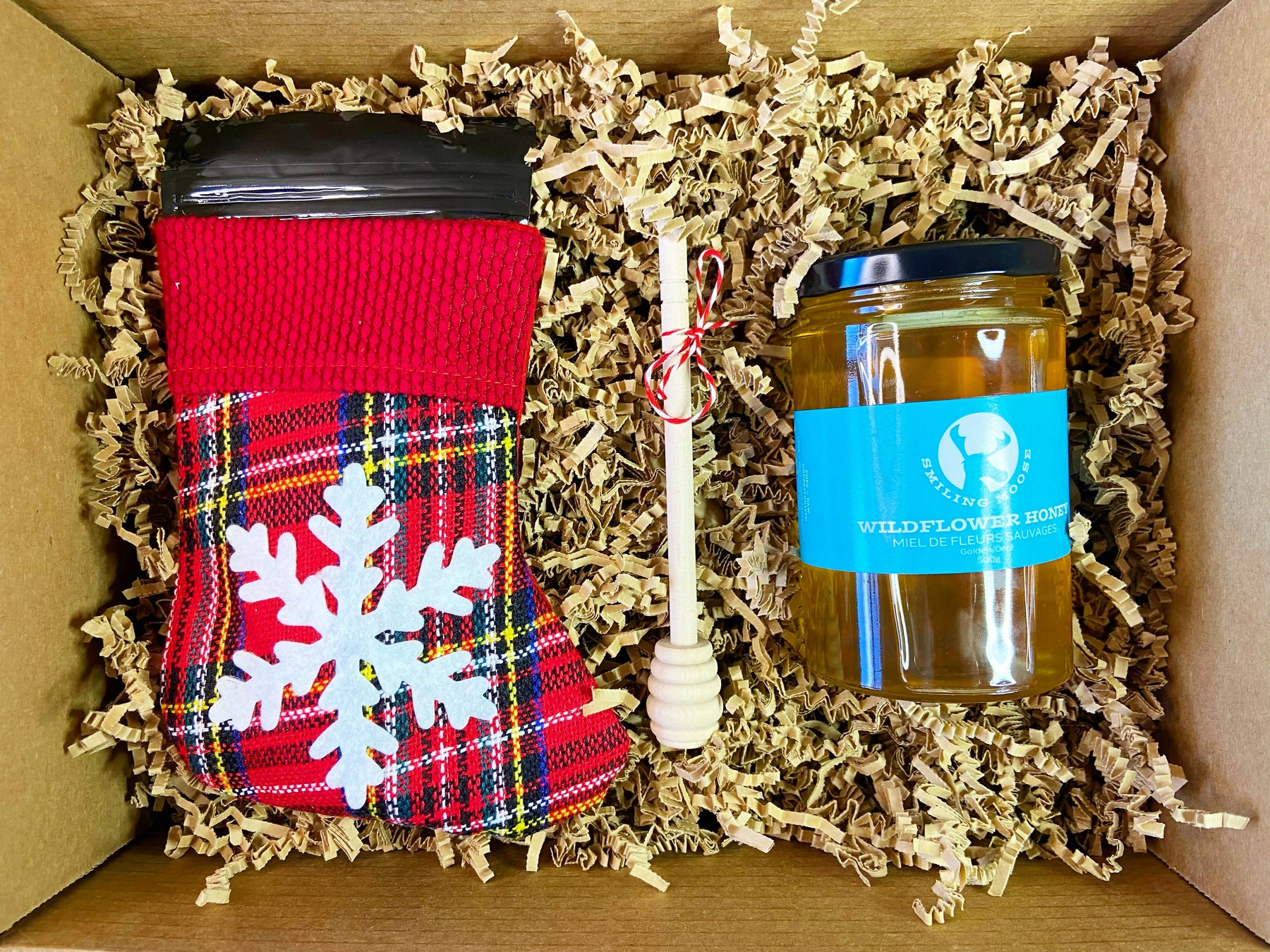 This Festive Local Gift Box includes a 500 g jar of Wildflower honey from Smiling Moose Farms, a package of Local Creamy Earl Grey Loose Tea from Diversitea, a wooden honey wand and a festive plaid stocking decoration. It's all wrapped up with a beautiful bow and rustic decoration.